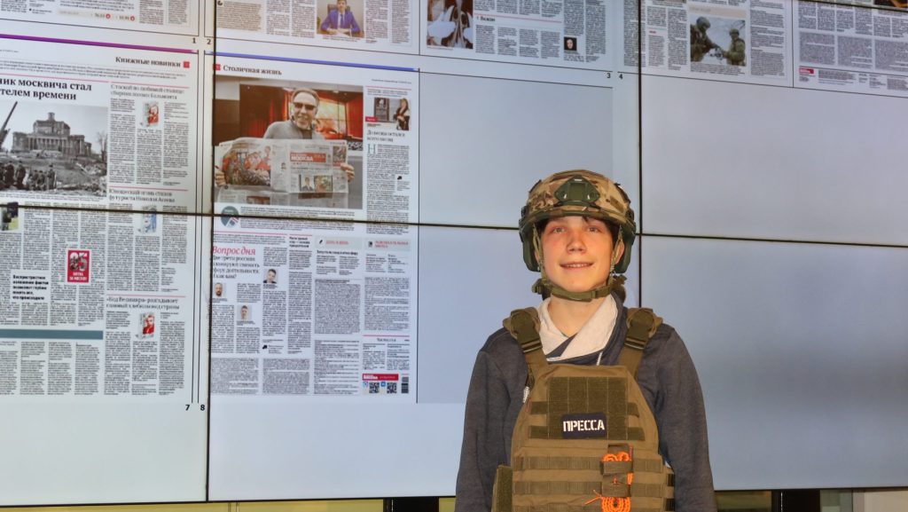 Автор репортажей из зоны спецоперации, материалов про наших бойцов, военкор Алексей Зернаков оказался улыбчивым и очень открытым человеком. Для начала он разложил перед нами сумку с «униформой» военного корреспондента. Сюда входят бронежилет, защитный шлем, наплечники, «сидушка», которая еще называется «пятиточечником» и служит для защиты от осколков. Ну и, конечно же, аптечка со всем необходимым, что может потребоваться в экстремальной ситуации. Когда мне предложили надеть это, я конечно же, согласился. Должен сказать, экипировка оказалась гораздо удобнее, чем я предполагал. Она, конечно, тяжелая, но совсем не сковывала движений. А после настал черед вопросов к нашему гостю. Ответы были очень откровенными и иногда — неожиданными.