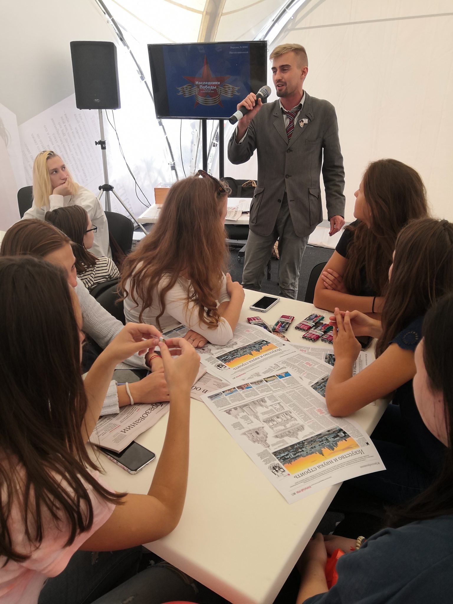 На территории фестиваля располагался целый городок, состоящий из разных тематических зон. В самом центре городка, да и моего внимания, была Книжная зона. Именно там прошел интерактивный открытый урок в рамках проекта «Пресса в образовании», посвященный 75-летию Победы в Великой Отечественной войне. Это было безумно увлекательно, полезно, а главное — поучительно как для самых больших, так и для самых маленьких посетителей фестиваля.