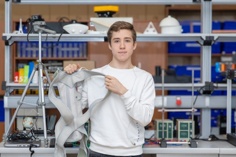 Ученик школы № 1576 Егор Булындин разработал умный анализатор осанки. Устройство крепится на корсет и с помощью датчиков определяет, когда человек сутулится, после чего подает вибрацию. В отличие от существующих аналогов, этот гаджет в будущем сможет подключаться к смартфону и показывать владельцу подробную статистику о осанке в течение дня.