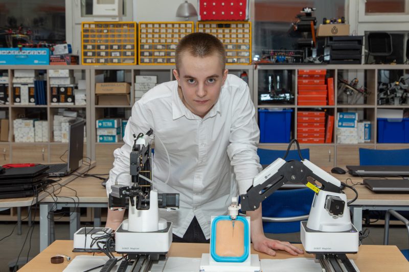 Ученик инженерного класса школы № 1571 Павел Рогонов создал прототип устройства для безопасного введения лекарств, которые применяются при диагностике и лечении онкологических заболеваний. Робот-манипулятор управляется дистанционно через компьютерную программу, а его конструкция включает свинцовые элементы для защиты от излучения. Это сводит риск облучения медперсонала к нулю. В будущем он планирует также добавить камеру для автоматического поиска вен на руке пациента.