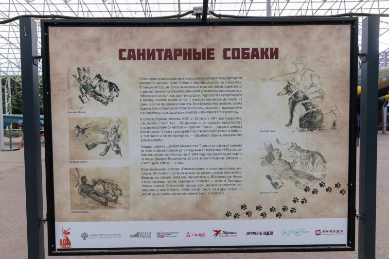 «Новая выставка Музея Победы посвящена Дню фронтовой собаки, который отмечается 19 августа. Во время Великой Отечественной войны четвероногие герои были связистами и санитарами, диверсантами и разведчиками. На всех фронтах несли службу более 60 тысяч специально обученных собак. Они вывезли из-под обстрелов около 700 тысяч раненых, обнаружили миллионы взрывных устройств, «работали» взрывниками. Безотказные помощники, они выполняли боевые задачи порой ценой собственной жизни. В память обо всех верных и бесстрашных четвероногих друзьях, которые вместе с красноармейцами сражались с врагом, по инициативе нашего музея девять лет назад был учрежден новый праздник, посвященный подвигу всех собак в годы Великой Отечественной войны», — отметил генеральный директор Музея Победы, заместитель секретаря Общественной палаты РФ Александр Школьник.