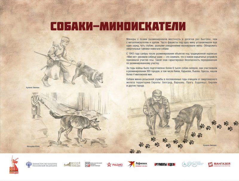 Планшетную выставку иллюстрируют графические работы учащихся МУДО «Красногорская детская художественная школа». Рисунки юных художников наглядно показывают, как собаки вели поиск раненых бойцов и вывозили их в упряжках, разыскивали мины в недоступных для миноискателей местах, обеспечивали контакт между войсковыми подразделениями. Посетителям выставки предлагают узнать о подвигах знаменитых собак-героев войны. Среди них – Джульбарс – самая известная собака минно-розыскной службы, чутье которой превышало норматив обычной собаки в два раза, овчарка-диверсант Дина, участвовавшая в подрыве железнодорожных составов и мостов, пес Рекс, трижды переплывший Днепр, передавая разорванным рекой соединениям важные донесения, и другие.