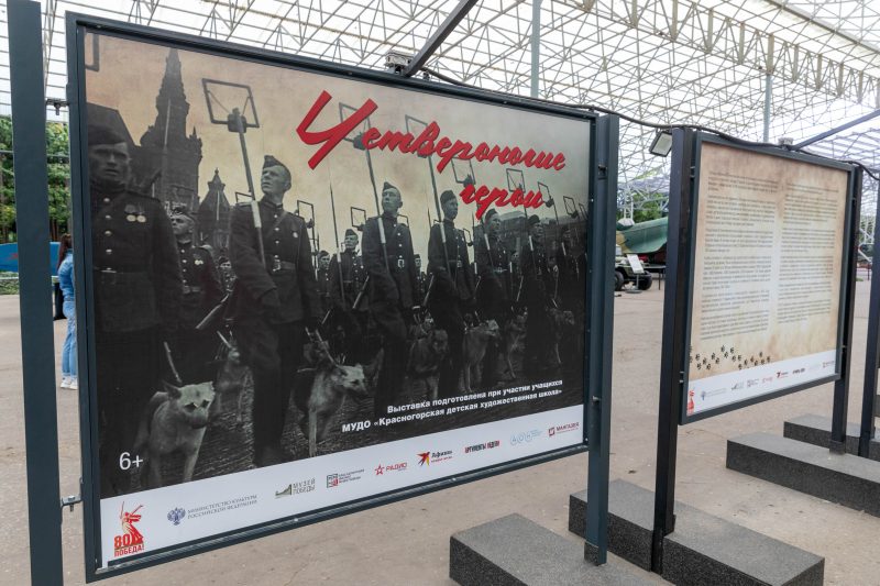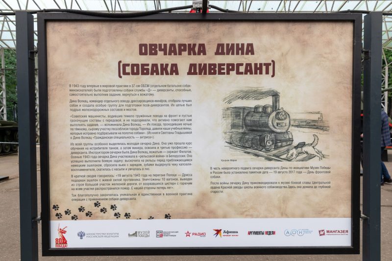 «Новая выставка Музея Победы посвящена Дню фронтовой собаки, который отмечается 19 августа. Во время Великой Отечественной войны четвероногие герои были связистами и санитарами, диверсантами и разведчиками. На всех фронтах несли службу более 60 тысяч специально обученных собак. Они вывезли из-под обстрелов около 700 тысяч раненых, обнаружили миллионы взрывных устройств, «работали» взрывниками. Безотказные помощники, они выполняли боевые задачи порой ценой собственной жизни. В память обо всех верных и бесстрашных четвероногих друзьях, которые вместе с красноармейцами сражались с врагом, по инициативе нашего музея девять лет назад был учрежден новый праздник, посвященный подвигу всех собак в годы Великой Отечественной войны», — отметил генеральный директор Музея Победы, заместитель секретаря Общественной палаты РФ Александр Школьник.