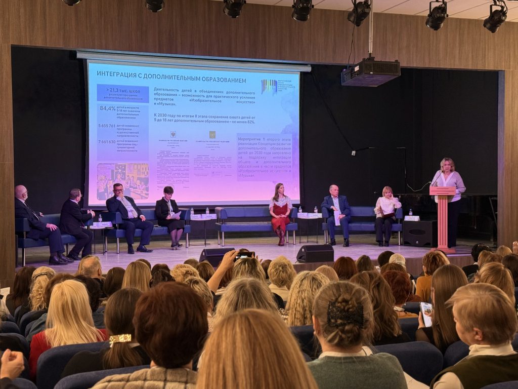 На пленарном заседании — учителя музыки и изобразительного искусства школ и учреждений дополнительного образования, методисты и руководители образовательных организаций, специалисты региональных органов власти, авторы учебно-методических пособий, студенты профильных вузов, музыканты и художники. В течение двух дней участники обсуждают реализацию федеральных рабочих программ по предметам «Музыка» и «Изобразительное искусство», обмениваясь идеями, методиками и живыми примерами.